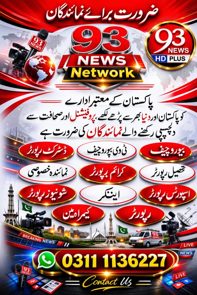 93 News ایک جدید اردو نیوز پلیٹ فارم ہے جو آپ کو پاکستان اور دنیا بھر کی تازہ ترین خبریں فراہم کرتا ہے۔ سیاست، معیشت، کھیل، شوبز، ٹیکنالوجی اور صحت کی مکمل اپڈیٹس اب ایک ہی جگہ۔ ہمارا مقصد ہے کہ قارئین کو بروقت، درست اور مستند خبریں پہنچائی جائیں۔